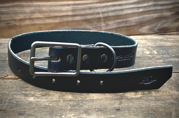 The Anne Oakley Dog Collar is handmade from 9-10 oz. English Bridle leather from Wickett & Craig. It is crafted to not only have a rugged look, but to be strong and comfortable for your pet. It comes with a solid Gunmetal center bar buckle and D-ring for your dog’s tags. The Anne Oakley Collar pairs perfectly with the Remi Leather Dog Leash.
